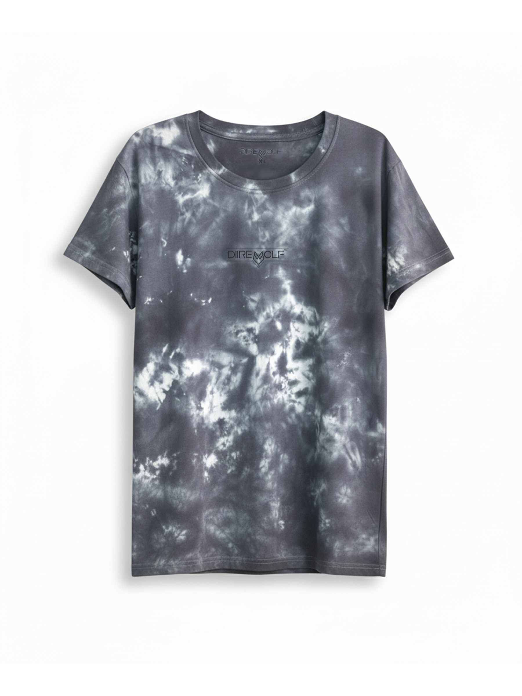 The Direwolf Tie-Dye T-Shirt, a unique piece that blends comfort with a fierce, independent spirit. The custom grey and white smoke-and-shadow tie-dye pattern ensures that no two shirts are exactly alike, giving you a truly original look.